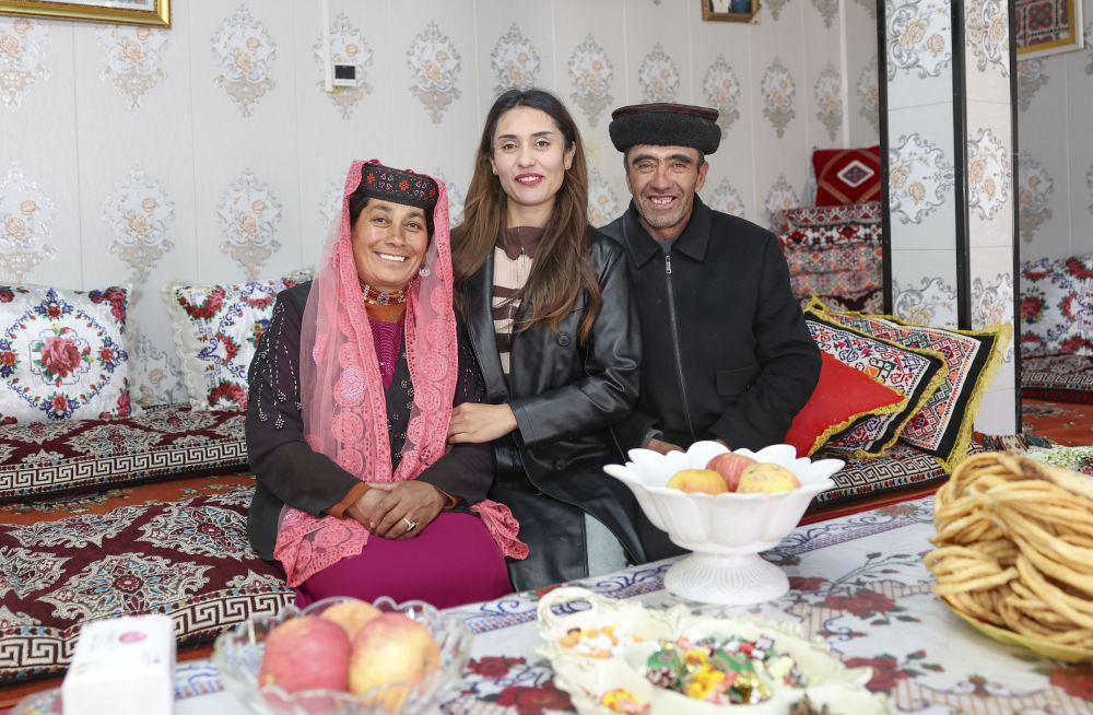 回家探親時,艾爾開牙·多力開(中)和父母在家中合影(2024年3月23日攝)。