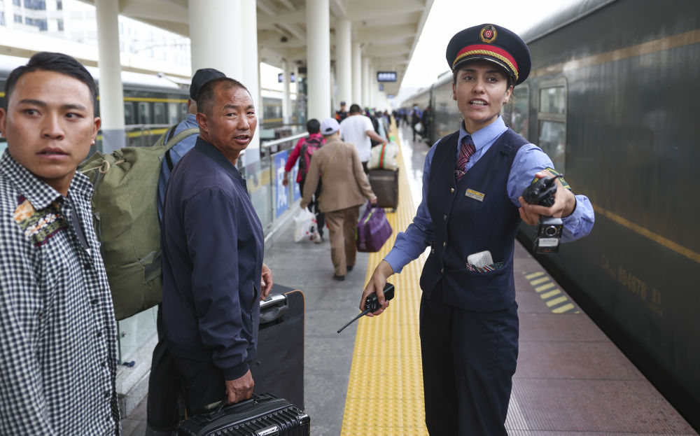 在成都西站,艾爾開牙·多力開(右)引導(dǎo)乘客登上由成都西開往喀什的列車(4月20日攝)。