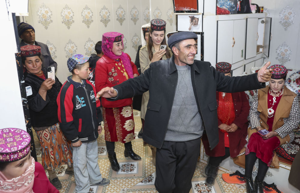 在位于新疆塔什庫爾干塔吉克自治縣瓦恰鄉(xiāng)夏布孜喀拉村的家中,父親多力開·百爾飛克跳起舞蹈慶祝女兒回家探親(2024年3月23日攝)。