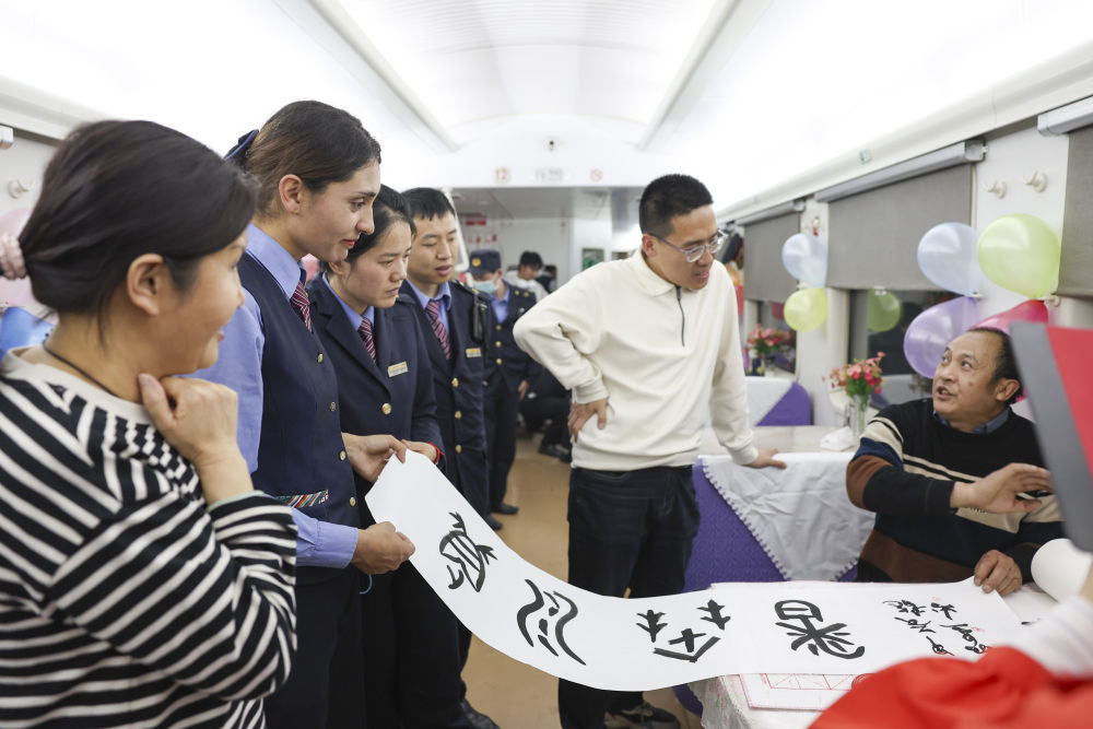 一名來自四川樂山的雕刻師(右一)向艾爾開牙·多力開(左二)帶領(lǐng)的乘組贈送書法作品“真水無香”,稱贊乘務(wù)員們的辛勤付出(4月19日攝)。