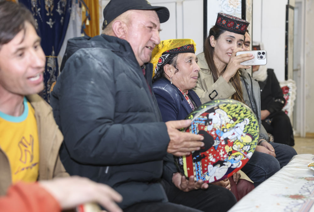 在位于新疆塔什庫爾干塔吉克自治縣瓦恰鄉(xiāng)夏布孜喀拉村的家中,艾爾開牙·多力開用手機記錄歡聚時刻(2024年3月23日攝)。