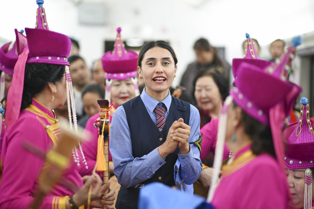 在由喀什開往成都西的列車上,艾爾開牙·多力開與民間藝人一起為乘客跳舞(4月19日攝)。