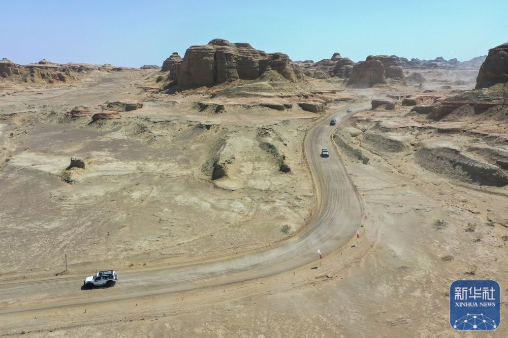 在新疆克拉瑪依市烏爾禾區(qū)世界魔鬼城景區(qū),車友在自駕線路上疾馳(5月1日攝,無人機照片)。