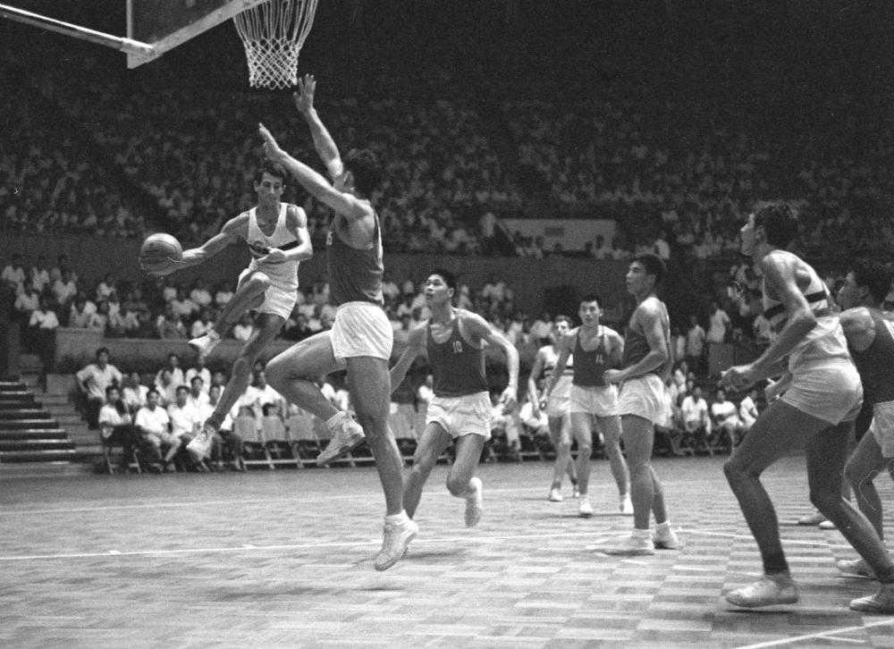 ↑1966年7月31日,法國男子籃球隊(duì)同中國男子籃球隊(duì)在北京工人體育館進(jìn)行訪華首場友誼賽。
