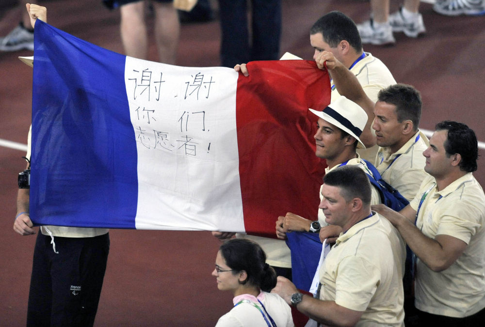 ↑2008年9月17日,法國代表團(tuán)在北京2008年殘奧會閉幕式上舉著寫有“謝謝你們志愿者”的國旗入場。