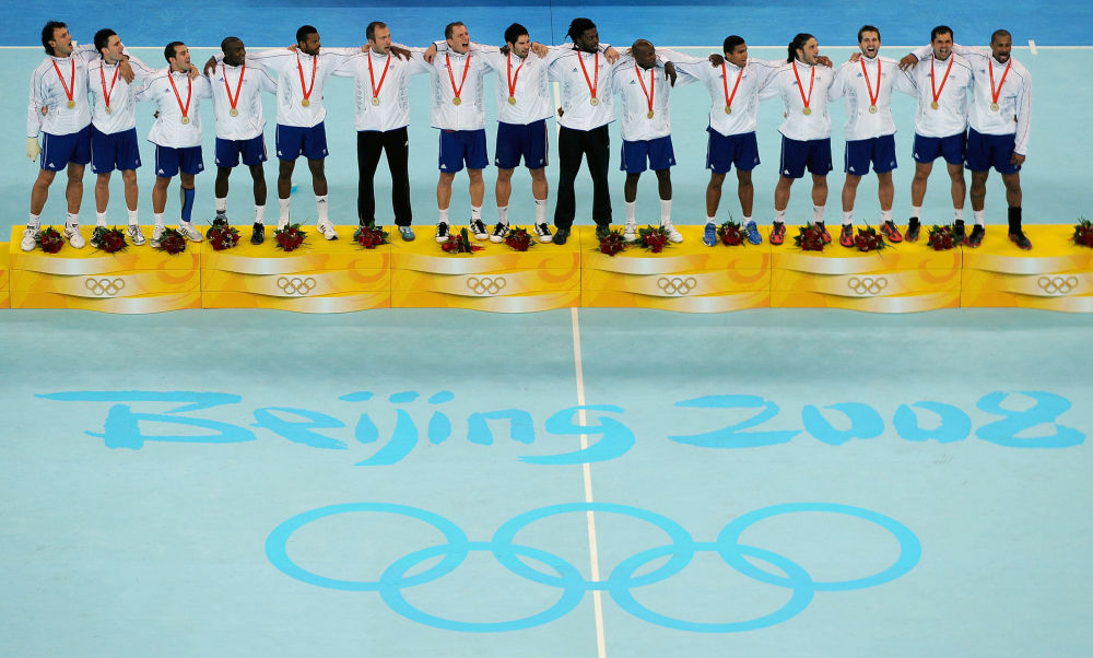 ↑2008年8月24日,法國隊(duì)球員在北京奧運(yùn)會男子手球冠軍領(lǐng)獎(jiǎng)臺上高唱國歌。