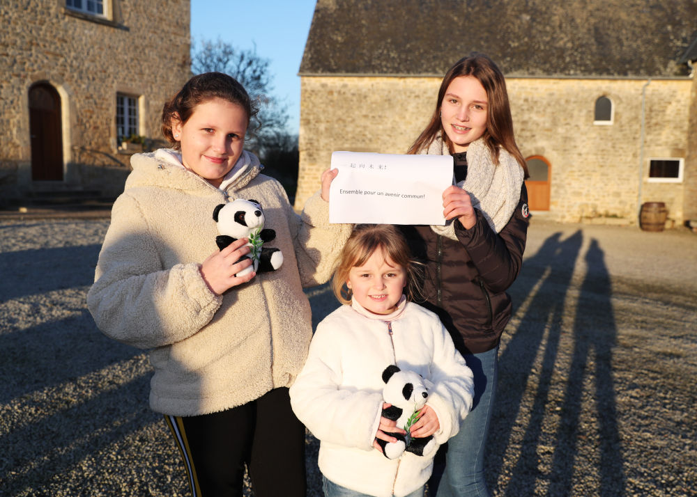 ↑2022年1月14 日,在法國芒什省梅奧蒂市,10 歲的安娜埃爾·瑪麗昂、5 歲的卡米耶·瑪麗昂和12歲的諾拉·瑪麗昂(從左至右)手舉“一起向未來”的主題口號,祝福北京冬奧會。