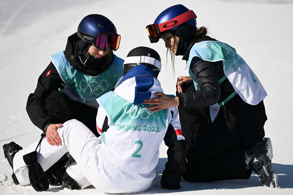 ↑2022年2月8日,中國選手谷愛凌(右)和瑞士選手瑪?shù)贍柕隆じ窭啄拢ㄗ螅┰诒本?022年冬奧會自由式滑雪女子大跳臺決賽后安慰法國選手泰絲·勒德。奧運(yùn)賽場外中法體育界展開多領(lǐng)域交流與合作2011年6月法網(wǎng)賽場上演中國奇跡29歲的中國姑娘李娜成為第一個(gè)奪得網(wǎng)球大滿貫賽事單打冠軍的亞洲人