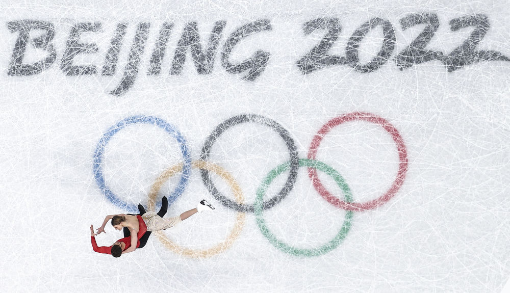 ↑2022年2月14日,法國選手加布麗埃拉·帕帕達(dá)基斯(上)和紀(jì)堯姆·西澤龍?jiān)诒本?022年冬奧會花樣滑冰冰上舞蹈比賽中,他們最終奪得該項(xiàng)目冠軍。