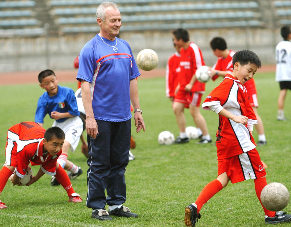 ↑2004年4月11日,法國青少年足球?qū)<野稀っ仔獱枴び诋?dāng)希(中)應(yīng)邀在貴陽輔導(dǎo)小學(xué)員訓(xùn)練。