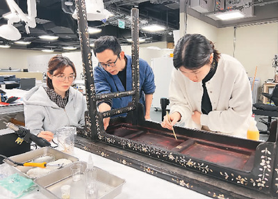 京港修復(fù)師共同為明代黑漆嵌螺鈿桌案進(jìn)行“會(huì)診”。 香港故宮文化博物館供圖