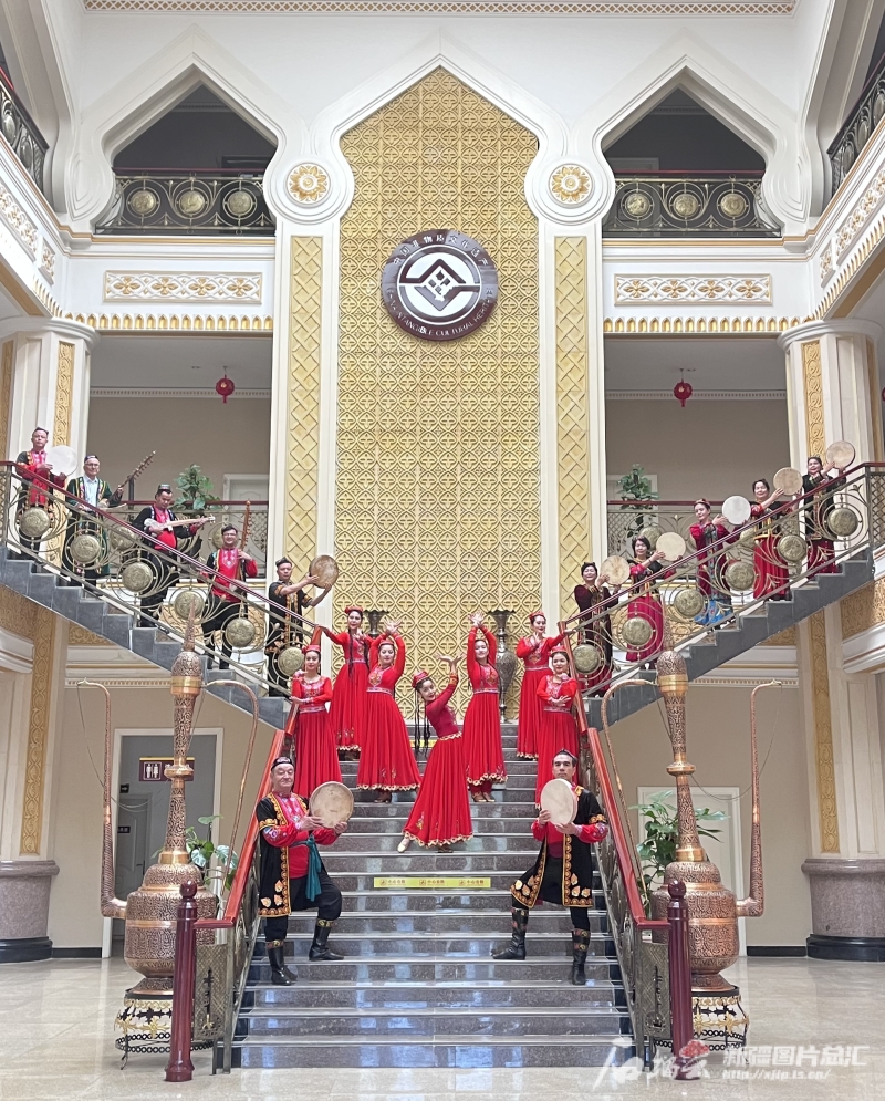 在哈密市非物質(zhì)文化遺產(chǎn)保護(hù)中心,回城鄉(xiāng)的傳承人們和當(dāng)?shù)匮輪T進(jìn)行哈密木卡姆表演。石榴云/新疆日?qǐng)?bào)記者 王晶晶攝