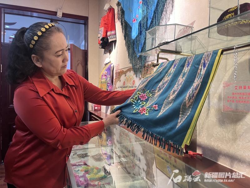 哈密刺繡國家級(jí)代表性傳承人阿加汗·賽買提家,不僅有刺繡工廠,還有一個(gè)展示哈密刺繡的展廳。石榴云/新疆日?qǐng)?bào)記者 王晶晶攝