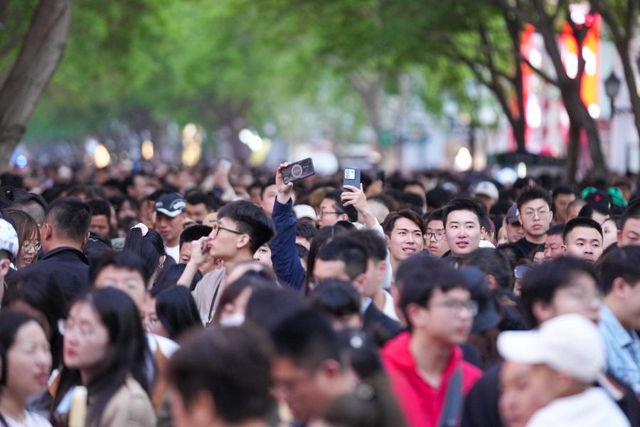5月1日,哈爾濱中央大街上人頭攢動(dòng)?!拔逡弧奔倨冢穆檬袌龌馃?。新華社記者 王建威 攝