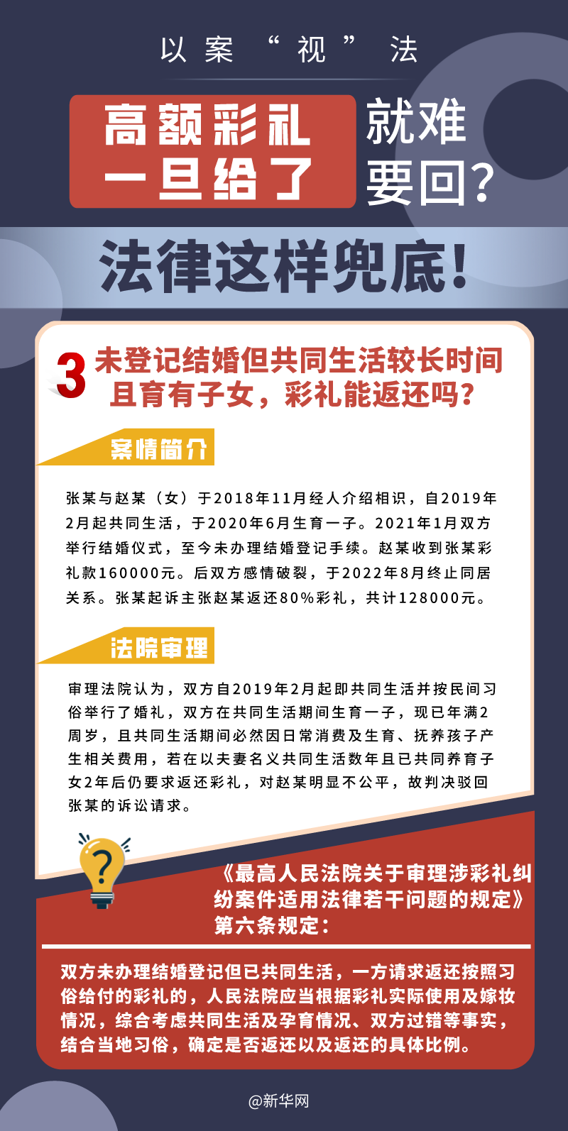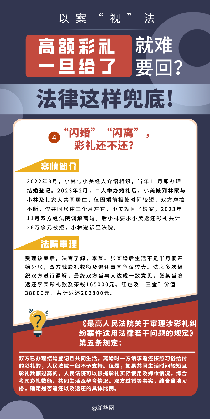 “五一”長假期間,各地迎來了婚禮高峰期,“彩禮”話題,尤其農村高額彩禮現象備受關注。破解高價彩禮,在解決爭議的層面,司法盡了最大努力兜底。本期《以案“視”法》針對涉“高額彩禮”糾紛,帶大家學習相關法律知識。