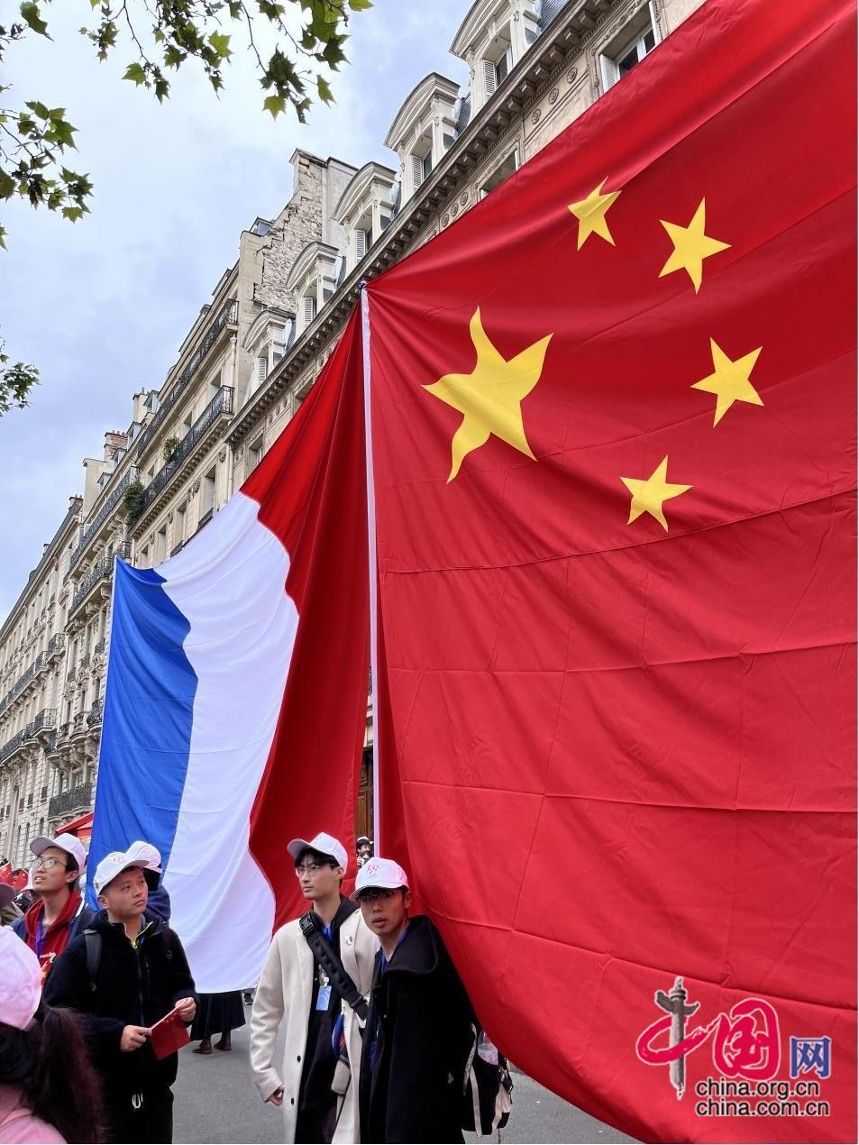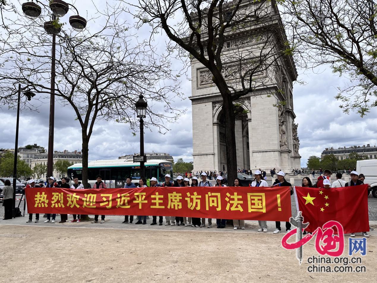 下午5時左右,習近平主席的車隊終于駛來,人群開始興奮,呼喊聲也逐漸高亢。卿馨月回憶,大家一遍又一遍地呼喊著:“歡迎,歡迎,熱烈歡迎”,不少人的嗓子喊破音了,但情緒卻愈發(fā)亢奮。當她看到由4個方陣連接而成的“中國-法國-中國-法國”巨型國旗陣赫然眼前時,她坦言,從未有一刻這么熱愛五星紅旗、從未有一刻為自己是中國人感到如此自豪。