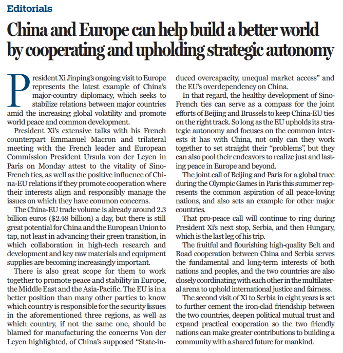 中國領導人此次歐洲之行旨在全球局勢日益動蕩之際穩(wěn)定大國關系和中歐關系,促進世界和平與共同發(fā)展。在促進歐洲、中東和亞太地區(qū)的和平與穩(wěn)定方面,中歐雙方有很大的合作空間。只要歐盟堅持戰(zhàn)略自主,著眼于中歐共同利益,雙方不僅可以攜手合作,還可以為實現(xiàn)歐洲和歐洲以外地區(qū)公正與持久的和平共同努力,為世界和平與發(fā)展以及人類的進步作出新的貢獻。