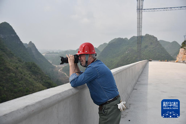 法國攝影師格雷瓜爾·戴高樂在花江峽谷大橋施工現(xiàn)場(chǎng)拍攝(4月27日攝)。新華社記者 駱飛 攝