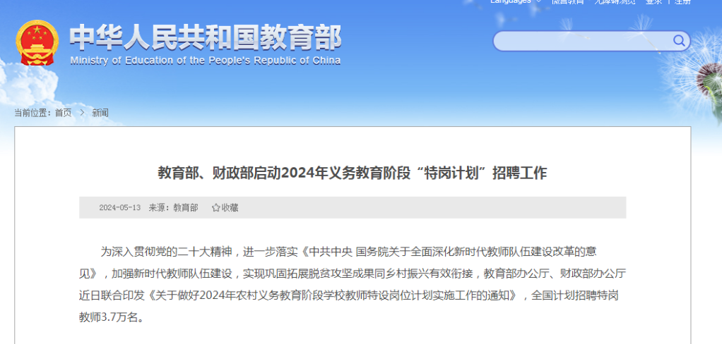 教育部、財政部啟動2024年義務(wù)教育階段“特崗計劃”招聘工作