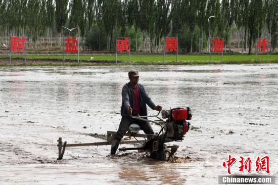 工作人員駕駛著插秧機(jī),搶抓農(nóng)時(shí)進(jìn)行“海水稻”播種工作。中