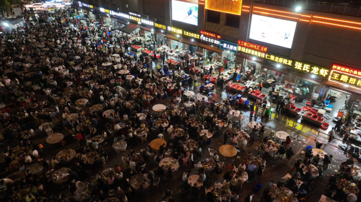 在江蘇盱眙的大桐農(nóng)貿(mào)市場,聚集著數(shù)十家以經(jīng)營小龍蝦為主的餐飲店、大排檔。暮色降臨,數(shù)千平方米的露天廣場上,游客座無虛席,空氣中彌漫著撲鼻香氣。