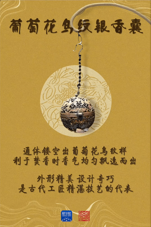 葡萄花鳥紋銀香囊體現(xiàn)了唐代貴族的生活意趣?!疤拼鐣?huì)的開放包容,人們生活中的儀式感都融入在這枚香囊之中?!标兾鳉v史博物館副研究館員賀達(dá)炘說。