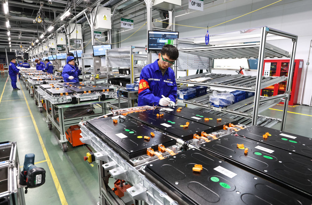 在上汽時(shí)代動(dòng)力電池系統(tǒng)有限公司車間,工人在安裝新能源汽車動(dòng)力電池系統(tǒng)(2023年2月16日攝)。