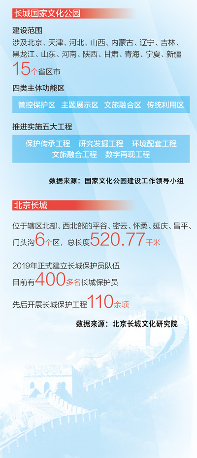 隨著長城國家文化公園建設(shè)推進(jìn),各地不斷創(chuàng)新長城保護(hù)方式,長城的保護(hù)狀況持續(xù)改善。2019年,中辦、國辦印發(fā)《長城、大運(yùn)河、長征國家文化公園建設(shè)方案》。2021年,國家文化公園建設(shè)工作領(lǐng)導(dǎo)小組印發(fā)的《長城國家文化公園建設(shè)保護(hù)規(guī)劃》提出,著力將長城國家文化公園打造為弘揚(yáng)民族精神、傳承中華文明的重要標(biāo)志。