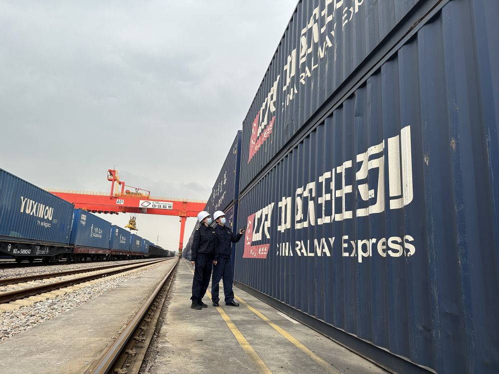 廣州海關(guān)所屬廣州車站海關(guān)關(guān)員對中歐班列出口貨物進(jìn)行監(jiān)管。(受訪者供圖)