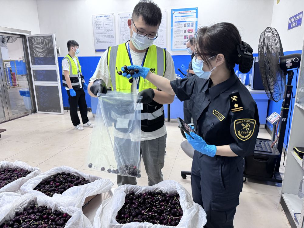 廣州白云機(jī)場海關(guān)關(guān)員對新產(chǎn)季進(jìn)口車?yán)遄舆M(jìn)行監(jiān)管。(受訪者供圖)