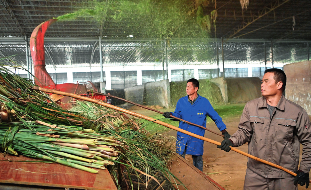工作人員在廣西來賓市興賓區(qū)大灣鎮(zhèn)雙誠牧業(yè)有限公司粉碎甘蔗尾葉,準備制作牛飼料(2023年12月13日攝)周華攝