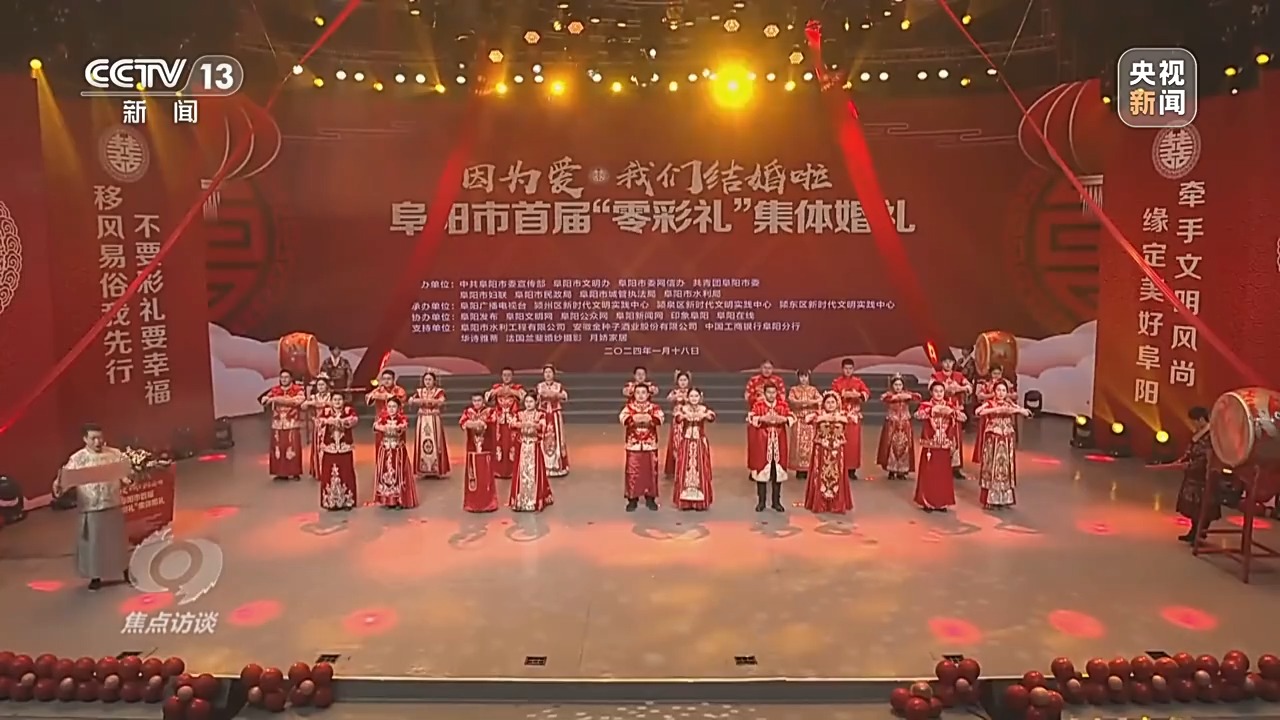 不久前,安徽阜陽當?shù)?0余家媒體共同直播了一場“零彩禮”集體婚禮,58對新人在親人、觀禮嘉賓及廣大網(wǎng)友祝福聲中,鄭重許下相守一生的承諾。