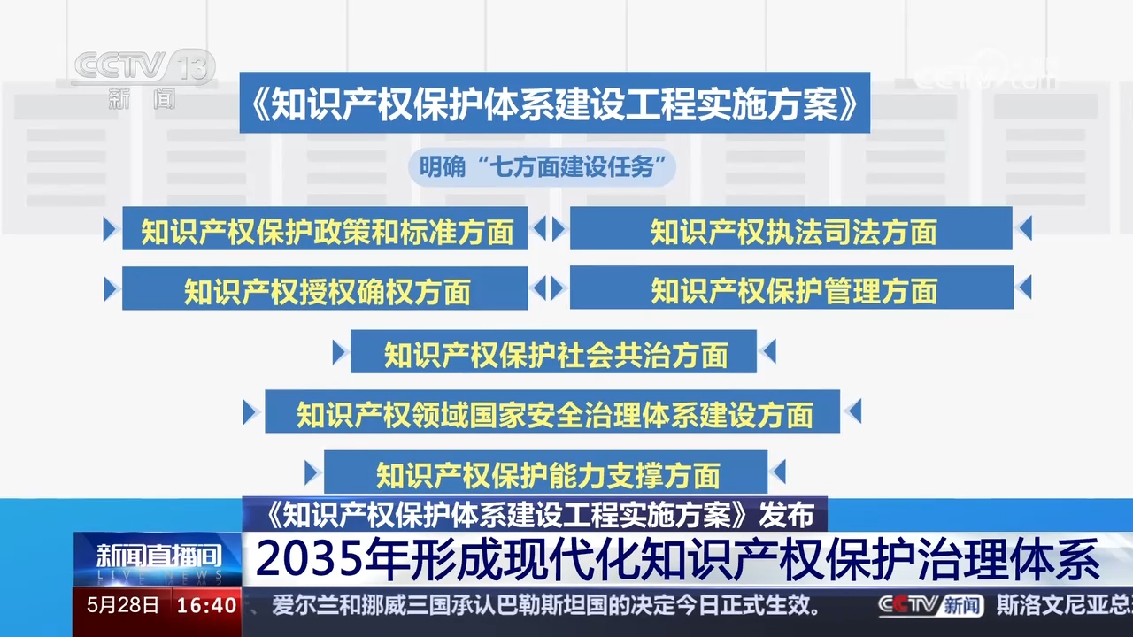 國(guó)家知識(shí)產(chǎn)權(quán)局5月28日舉行新聞發(fā)布會(huì),重點(diǎn)介紹《知識(shí)產(chǎn)權(quán)保護(hù)體系建設(shè)工程實(shí)施方案》(以下簡(jiǎn)稱《方案》)有關(guān)情況?!斗桨浮访鞔_,到2035年,知識(shí)產(chǎn)權(quán)保護(hù)體系和保護(hù)能力現(xiàn)代化基本實(shí)現(xiàn),形成政府履職盡責(zé)、執(zhí)法部門(mén)嚴(yán)格監(jiān)管、司法機(jī)關(guān)公正司法、經(jīng)營(yíng)主體規(guī)范管理、行業(yè)組織自律自治、社會(huì)公眾誠(chéng)信守法的現(xiàn)代化知識(shí)產(chǎn)權(quán)保護(hù)治理體系。