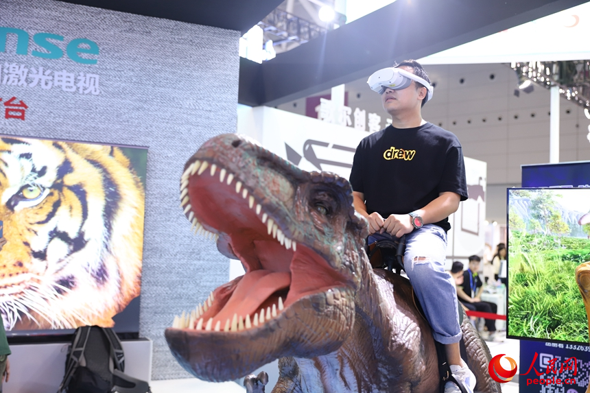 戴上VR設(shè)備,進入“侏羅紀時代”。人民網(wǎng) 劉森君攝