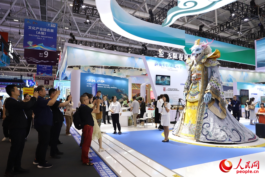 遼寧展區(qū),仿生互動人型機甲龍王“敖寶”吸引觀眾拍照、互動。人民網(wǎng) 劉森君攝