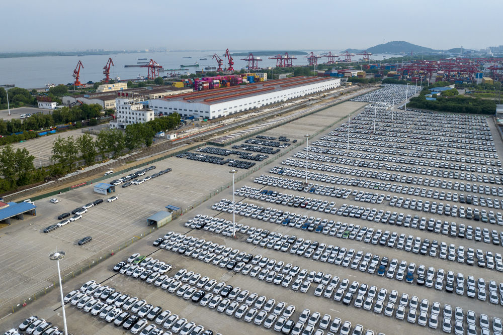 5月26日,在安徽蕪湖港朱家橋港區(qū)國際集裝箱碼頭,整齊排列的汽車等待出口(無人機(jī)照片)。 新華社發(fā)(肖本祥 攝)