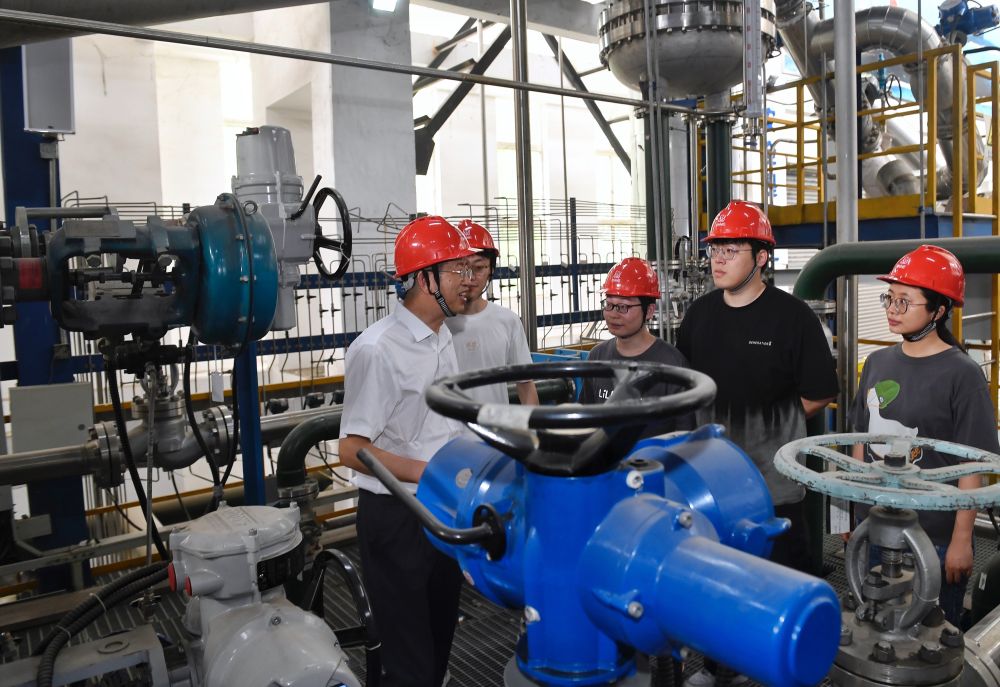 5月24日,在位于成都的中國(guó)核動(dòng)力研究設(shè)計(jì)院內(nèi),鐘元章(左一)與團(tuán)隊(duì)年輕人在試驗(yàn)臺(tái)架上交流。