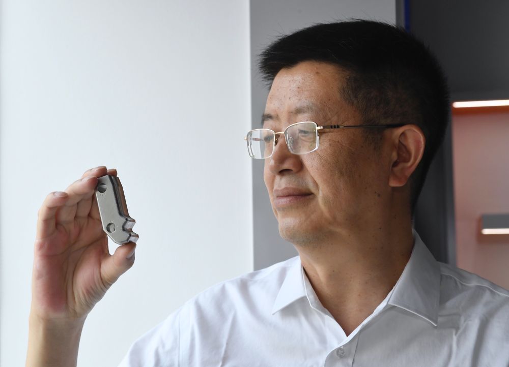 5月24日,在位于成都的中國(guó)核動(dòng)力研究設(shè)計(jì)院內(nèi),鐘元章在展示通過3D打印的堆內(nèi)構(gòu)件堆芯圍筒。鐘元章介紹,通過3D打印的方式來生產(chǎn)“華龍一號(hào)”的零部件,是目前的一個(gè)研究方向。