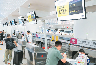 在廣東深圳寶安國際機場,搭乘深圳—墨西哥城直飛航線的乘客辦理值機。