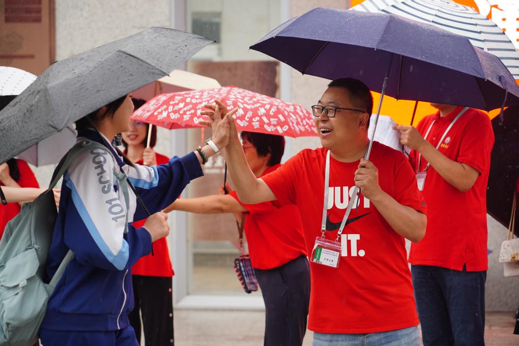 雖然天空下著雨,北京一零一中學(xué)的送考老師們還是早早在校門(mén)口排成一列,與陸續(xù)趕來(lái)的考生一一擊掌鼓勁。在校門(mén)口刷臉驗(yàn)證身份后,考生通過(guò)提前搭設(shè)的紅色晴雨走廊,步入候考區(qū)及考場(chǎng)。