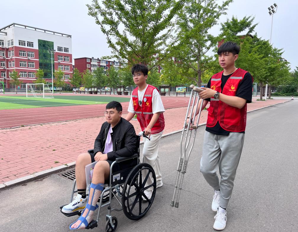 沈陽(yáng)城市學(xué)院志愿者推坐輪椅的考生進(jìn)入考場(chǎng)。(沈陽(yáng)城市學(xué)院供圖)