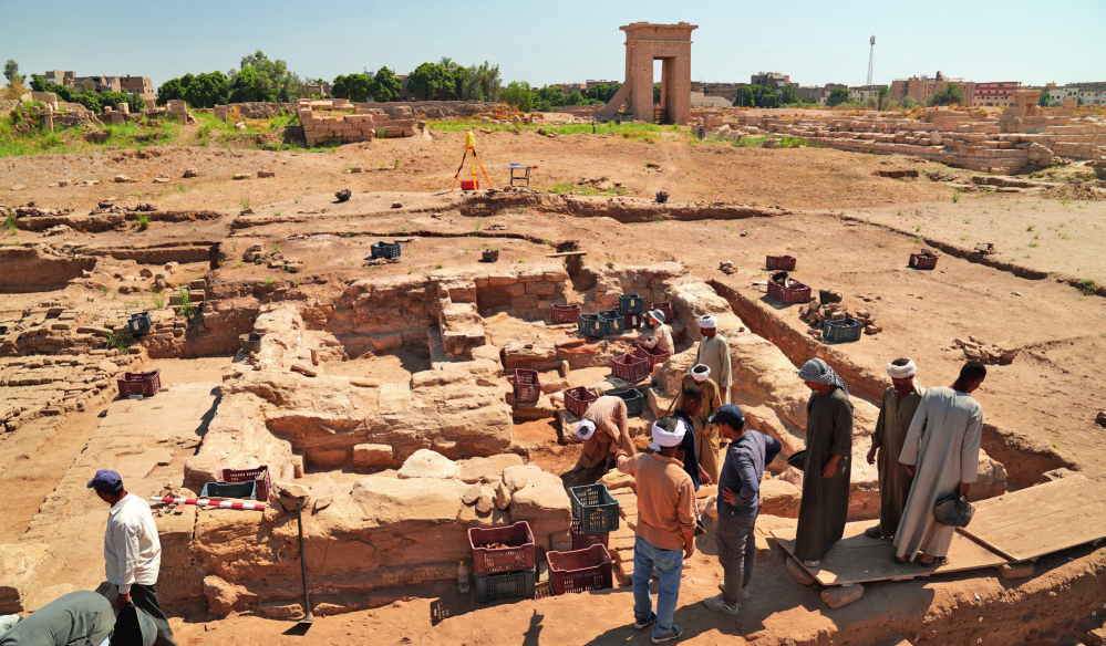 在中埃盧克索孟圖神廟聯(lián)合考古項(xiàng)目所在地,工作人員挖掘清理神廟遺址附近的第四小神殿(2024年5月7日攝)。中埃聯(lián)合考古項(xiàng)目組供圖