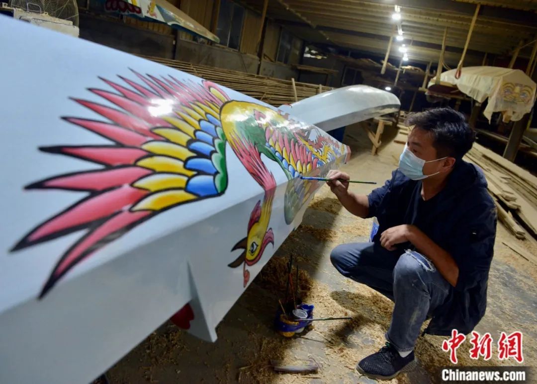 “龍舟世家”方忠雄龍舟廠畫花師傅在對(duì)龍舟“化妝”。一條龍舟基本是船頭和船身畫蓮花、壽桃、鯉魚等,寓意吉祥如意。在船尾,則是畫龍、鳳、鷹等靈禽猛獸,寓意霸氣威武。中新社記者 張斌 攝