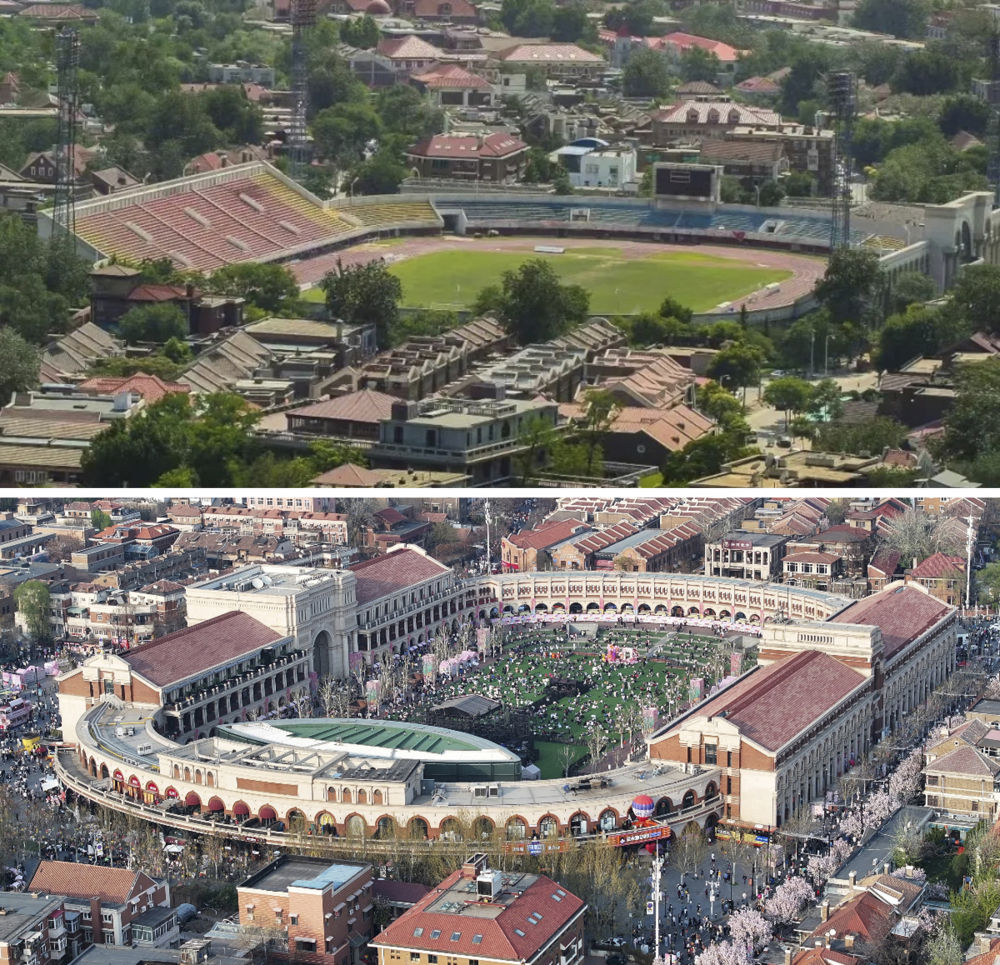 拼版照片:上圖是位于天津五大道的民園體育場(資料照片);下圖是2024年4月6日拍攝的民園廣場(新華社記者趙子碩攝)。民園廣場的前身是始建于1920年的民園體育場,曾是中國的第一個(gè)燈光足球場。經(jīng)過提升改造,現(xiàn)在的民園廣場已經(jīng)成為中西合璧的“城市會(huì)客廳”。新華社發(fā)