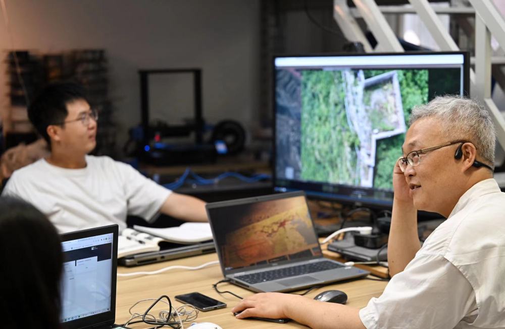 天津大學(xué)建筑學(xué)院教授李哲(右)和學(xué)生在工作室內(nèi)就拍攝的長城圖像進(jìn)行交流。新華社記者李然 攝