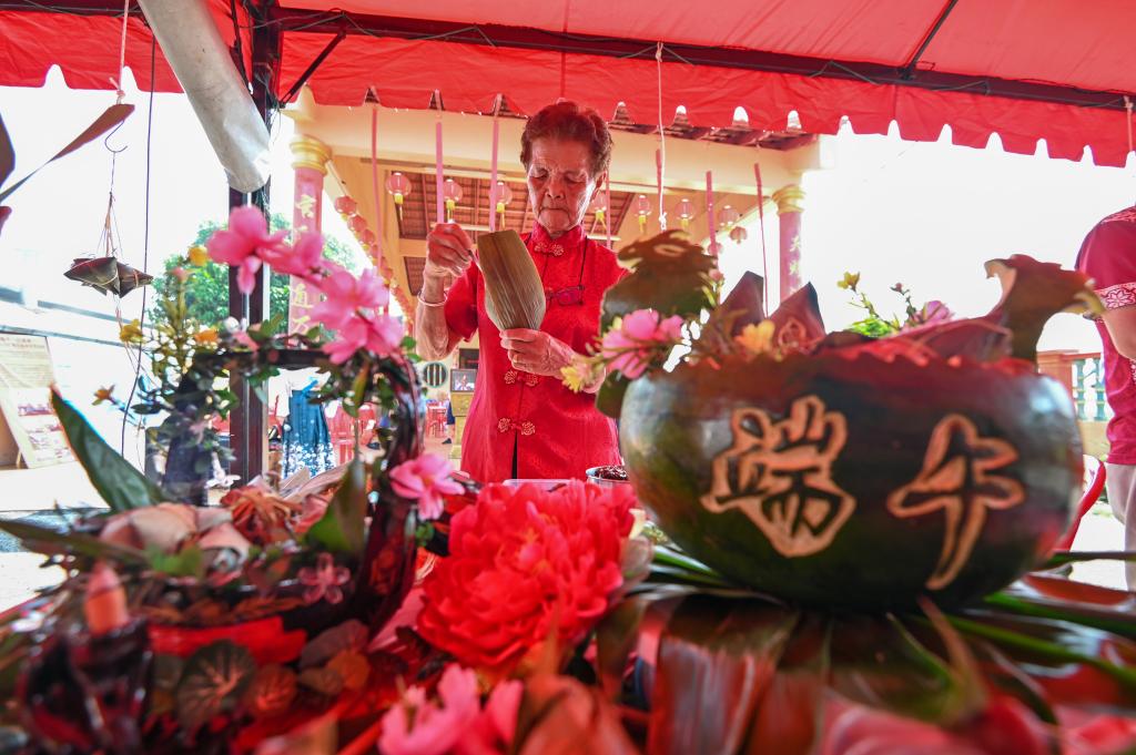 6月8日,一名女子在馬來西亞馬六甲市參加裹粽子比賽。當(dāng)日,馬來西亞馬六甲市舉辦“2024年慶端午”系列活動,人們以裹粽子、游龍舟等方式迎接端午節(jié)。新華社 張紋綜 攝