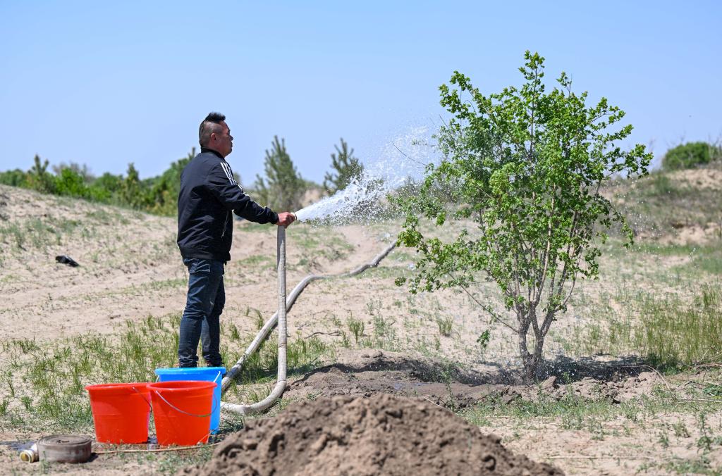 5月15日,在內(nèi)蒙古通遼市科左后旗甘旗卡鎮(zhèn)巴克要系統(tǒng)化治理項(xiàng)目區(qū),工作人員在給一棵楓樹(shù)澆水。新華社 連振 攝