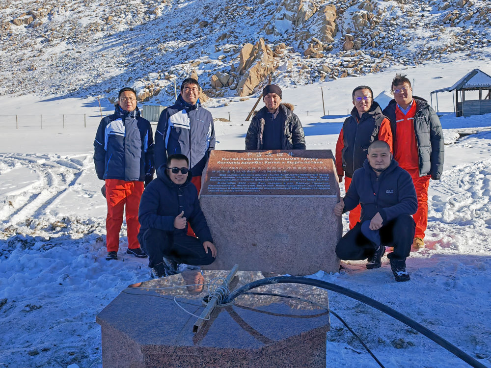 執(zhí)行中吉烏鐵路可行性研究的中鐵第一勘察設(shè)計(jì)院專家團(tuán)隊(duì)成員在吉爾吉斯斯坦納倫州的“中吉友誼井”(前)和紀(jì)念石碑旁合影(2022年11月26日攝)。新華社發(fā)(中鐵第一勘察設(shè)計(jì)院供圖)