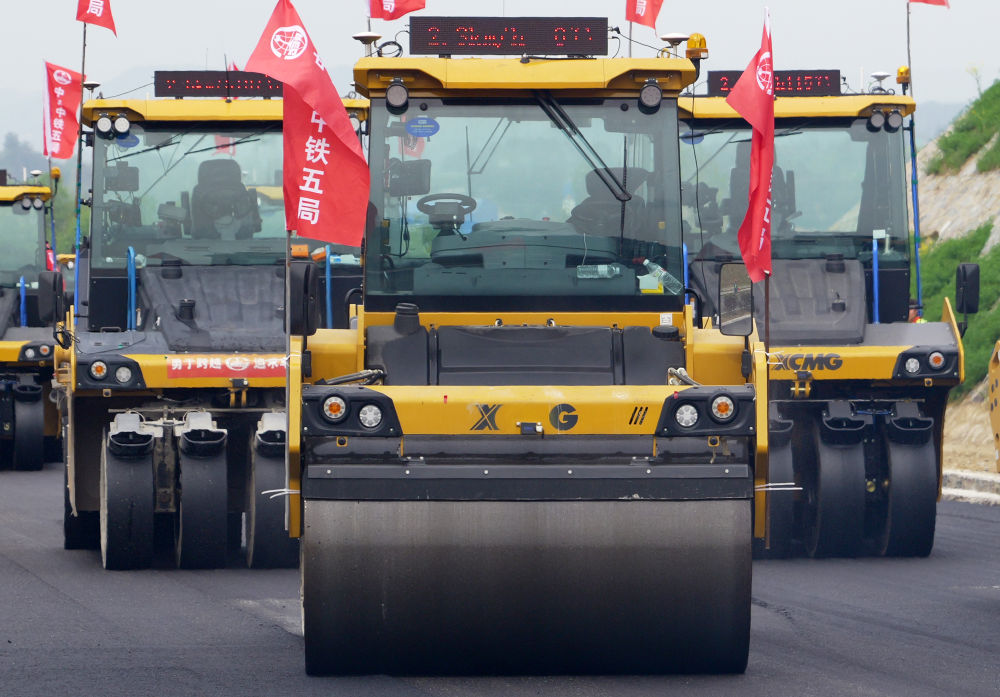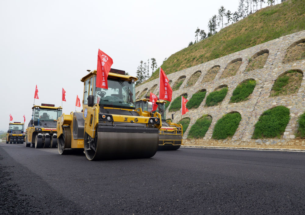 2024年4月11日,在河南省新縣,無人駕駛壓路機(jī)在由中鐵五局承建的沿大別山高速公路雞公山至商城段進(jìn)行施工作業(yè)。 新華社記者 李嘉南 攝