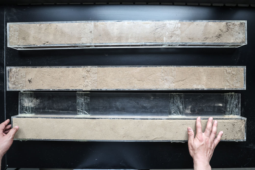 “草根博士”呂林有在遼寧省農(nóng)業(yè)科學(xué)院沙地治理與利用研究所章古臺基地實(shí)驗(yàn)室整理提取的沙地土壤剖面樣本(2024年5月30日攝)。新華社記者 潘昱龍 攝